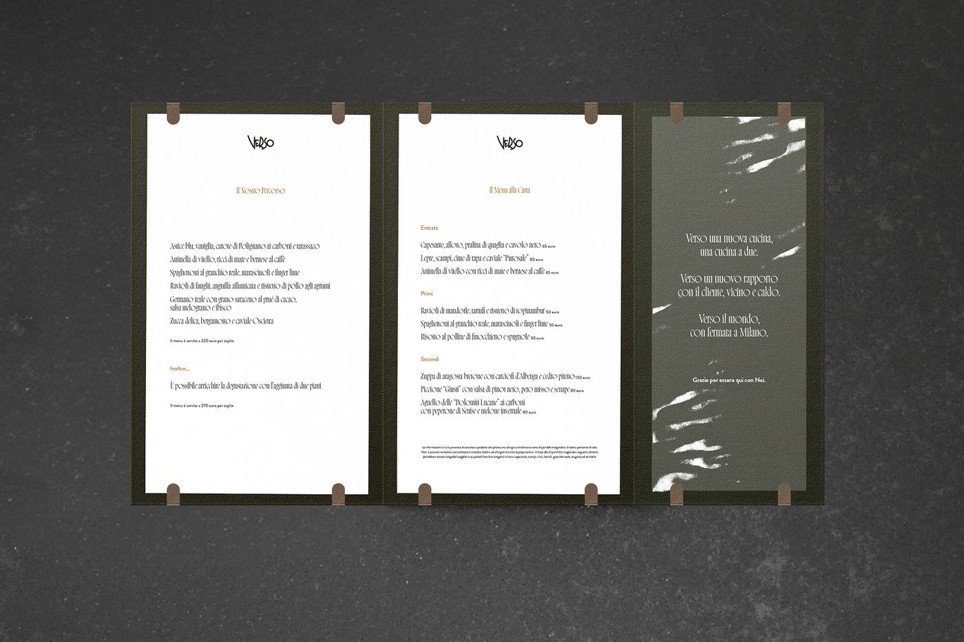 Nel progettare il logo di Verso abbiamo evitato i codici visivi tipici del fine dining, scegliendo un segno più identitario: una tipografia disegnata su misura che riconduce l'estetica dei graffiti, radicata nel percorso di uno degli chef, all'interno di un contesto d'alta cucina.